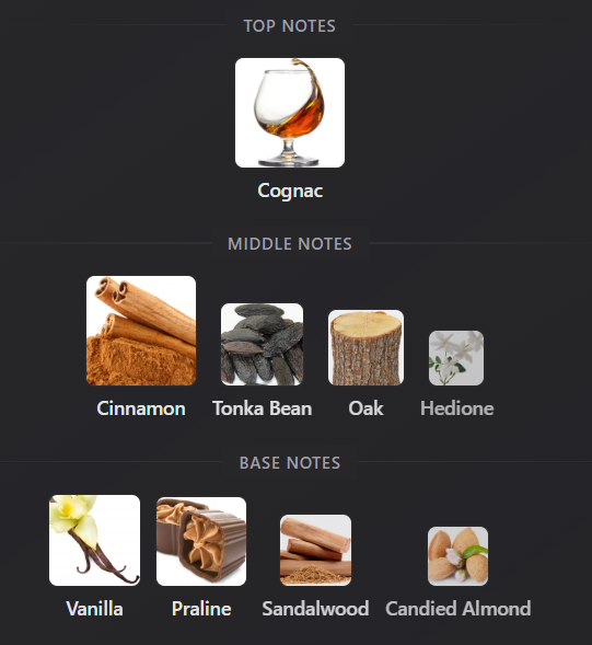 woody. warm spicy. sweet. vanilla. cinnamon. Cognac.